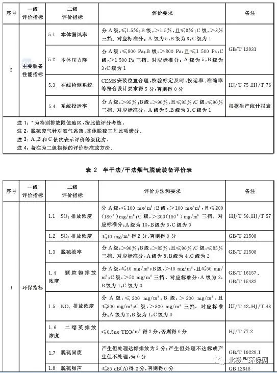 日前,中華人民共和國國家質量監督檢驗檢疫總局、中國國家標準化管理委員會發布《鋼鐵燒結煙氣脫硫除塵裝備運行效果評價技術要求GB/T 34607-2017 》。根據標準要求,鋼鐵燒結煙氣脫硫除塵裝備運行效果評價總分為100分,其中:脫硫裝備包括環保性能評價30分,技術經濟評價15分,資源和能源消耗評價25分、生產管理評價10分和主要裝備性能評價20分;除塵裝備包括環保性能評價40分,生產管理評價20分和主要裝備性能評價40分。濕法脫硫性能指標包括SO2排放濃度、SO3排放濃度、脫硫效率、霧滴濃度、顆粒物排放濃度、NOx濃度、二惡英濃度等,詳見表1。半干法/干法脫硫性能指標包括SO2排放濃度、SO3排放濃度、脫硫效率、顆粒物排放濃度、NOx濃度、二惡英濃度等,詳見表2。電除塵、袋除塵主要性能指標包括顆粒物濃度、去除率、本體漏風率、壓力降等,詳見表3、4。